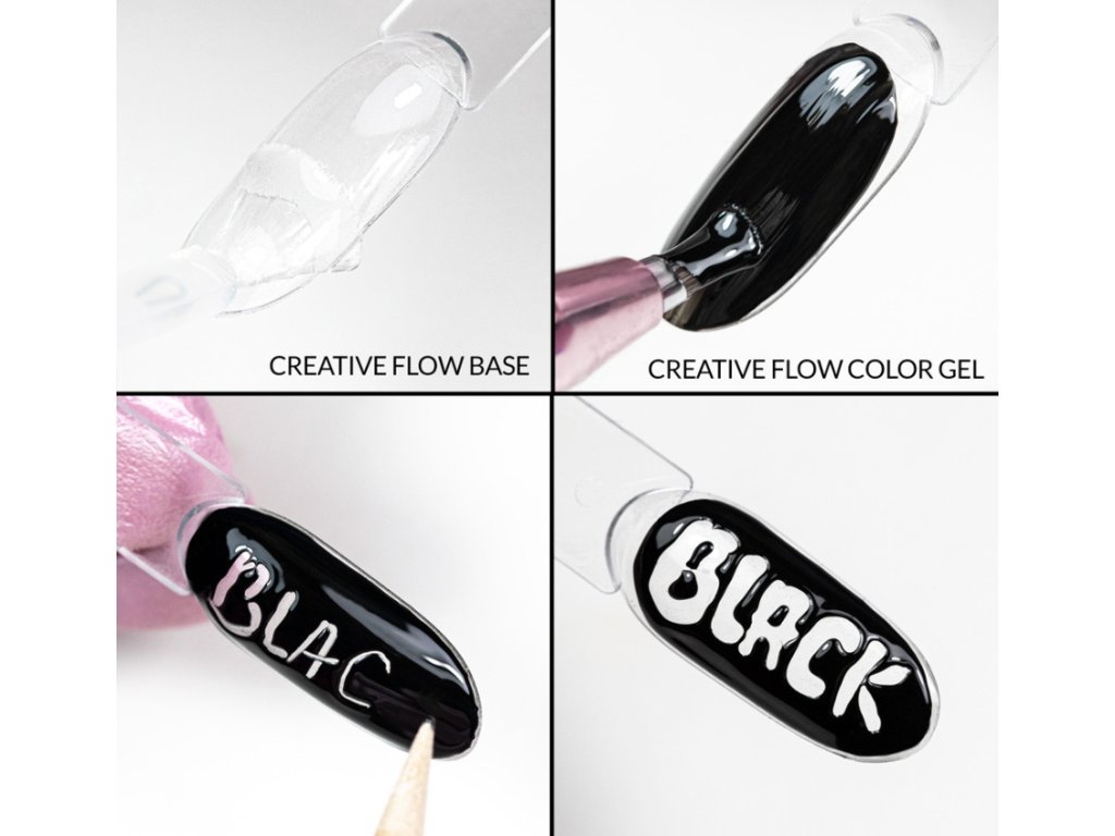 Gel Creative Flow v kombinaci se speciální podkladovou bází Creative Flow Base od Molly Nails vám umožní vytvářet jedinečná písmena, nápisy, tečky, květiny, cákance, 3D vzory a abstraktní tvary , které vypadají, jako by se jemně rozlily nebo roztavily.